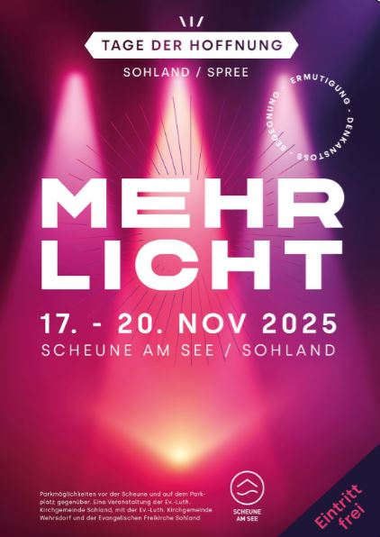Vier Abende voller Musik, Begegnung, ehrlicher Impulse und neuer Perspektiven. Woher kommt das Licht, das stärker ist als unsere Dunkelheit? Hat das Leben noch Sinn, wenn vieles um mich herum zerbricht? Und geht’s im Leben um möglichst viele High-Lights? Oder gibt es etwas, das uns dauerhaft ausfüllen kann? Darüber spricht Alexander Gart, Gründer der Jungen Kirche Berlin – ein leidenschaftlicher Redner, der Glauben frisch, ehrlich und mitten ins Leben bringt. Komm vorbei – ob mit Fragen, mit Zweifeln oder einfach aus Neugier. Erlebe vier Abende, die guttun, aufbauen und vielleicht dein Herz ein Stück heller machen.